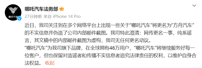 12月8日,哪吒汽车法务部发文称,“近日,我司热心到在多个收集平台上出现一些对于‘哪吒汽车将更名为方舟汽车的伪善信息并伪造了公司里面邮件’截图。”